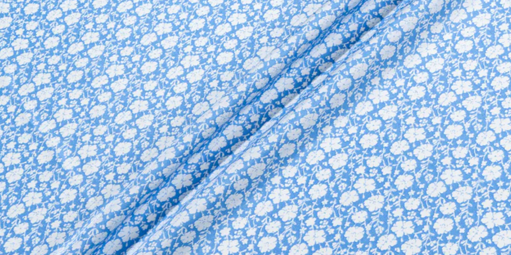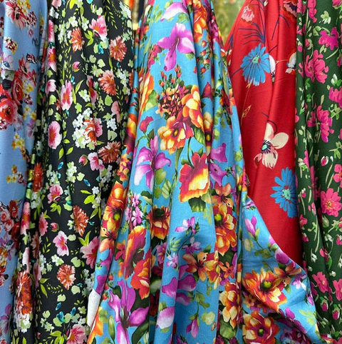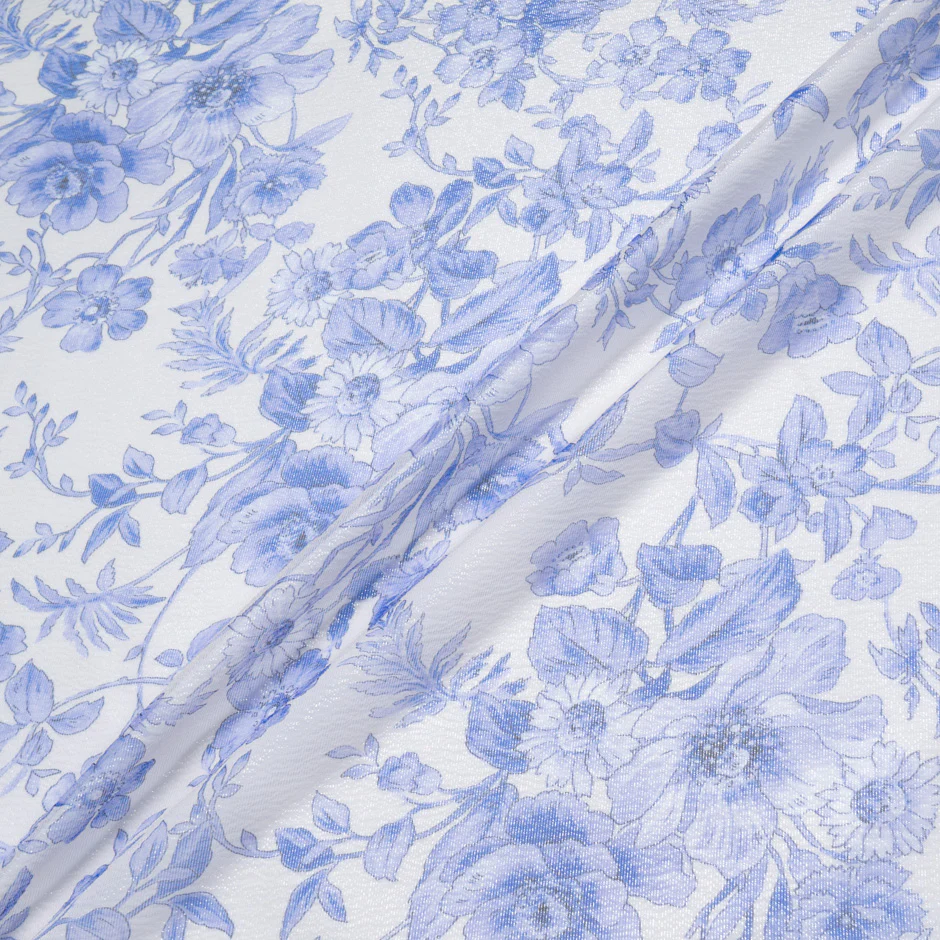 A pretty multi-coloured floral print on a rich sky blue silk georgette with gold metallic spot jacquard. This luxurious silk by Chiara Santoni is ideal for pretty blouses, skirts and floor length dresses and available in a variety of colour ways and finishes.